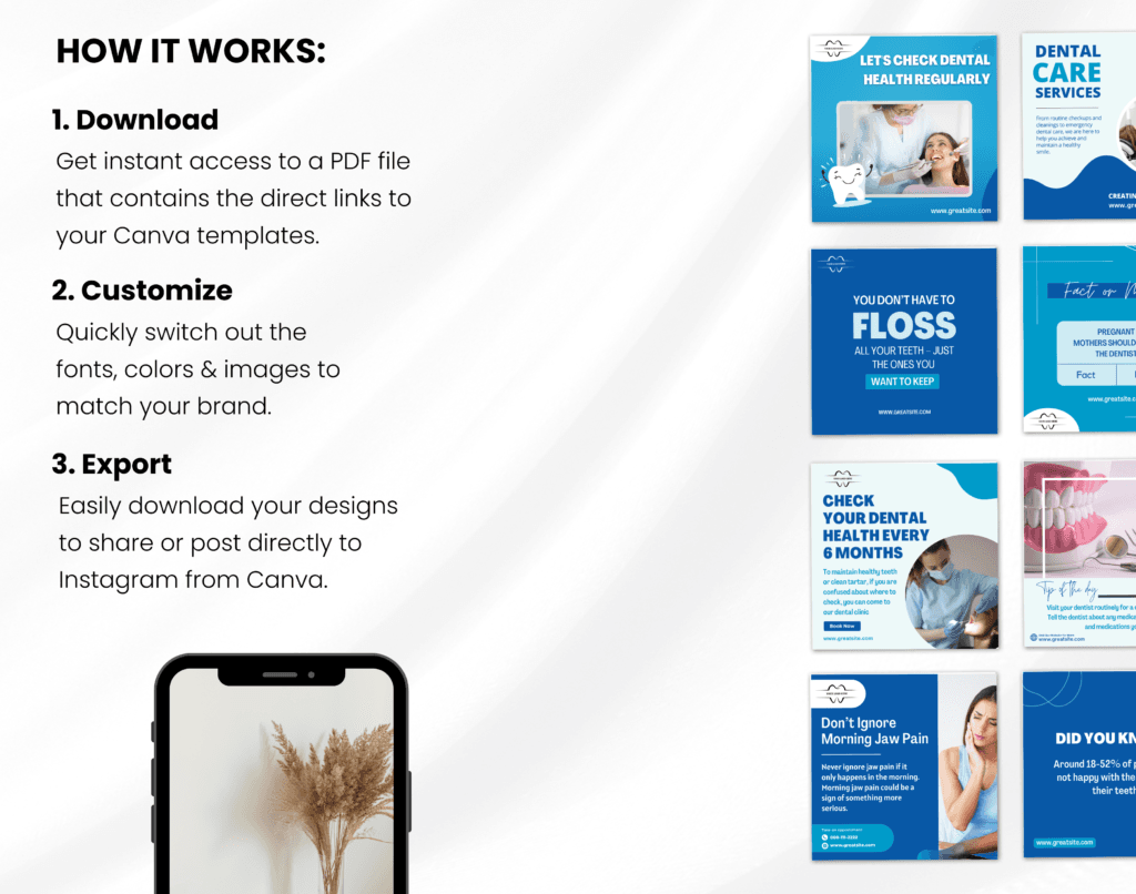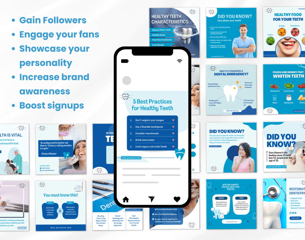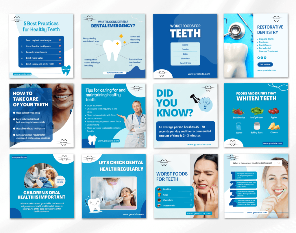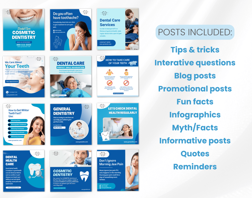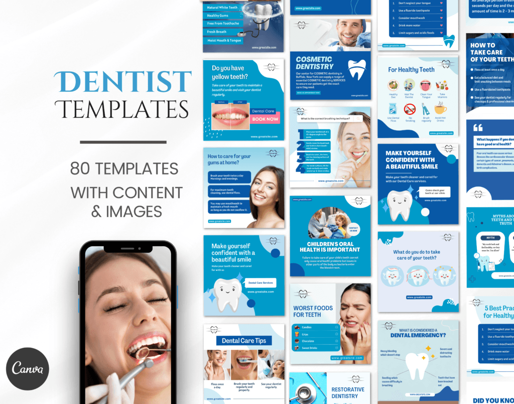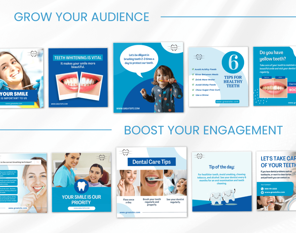 Elevate your dental practice’s social media with 80 ready-to-use, customizable templates designed for dentists! These templates boost engagement, strengthen your message, and help turn followers into loyal patients. Perfect for Facebook, Instagram, LinkedIn, Pinterest, and X, they make it easy to create a polished, impactful presence across platforms. ✨