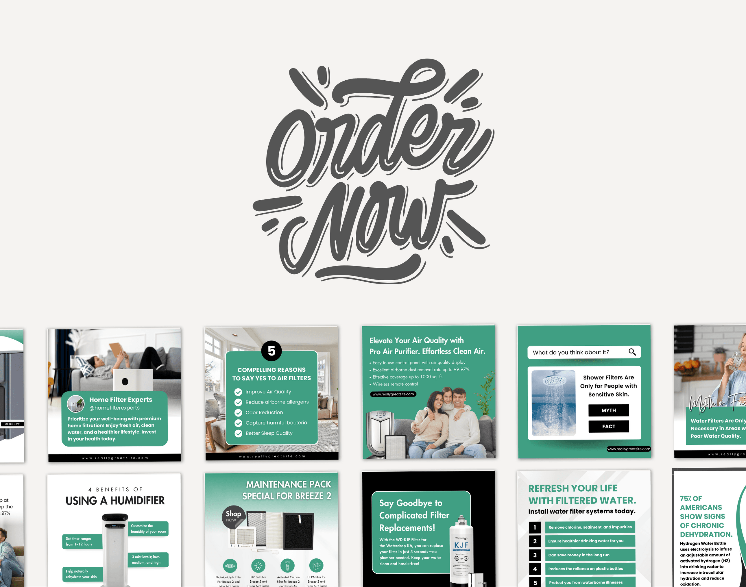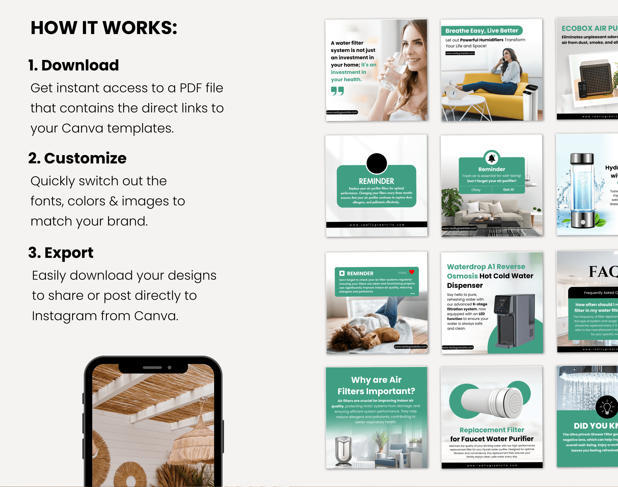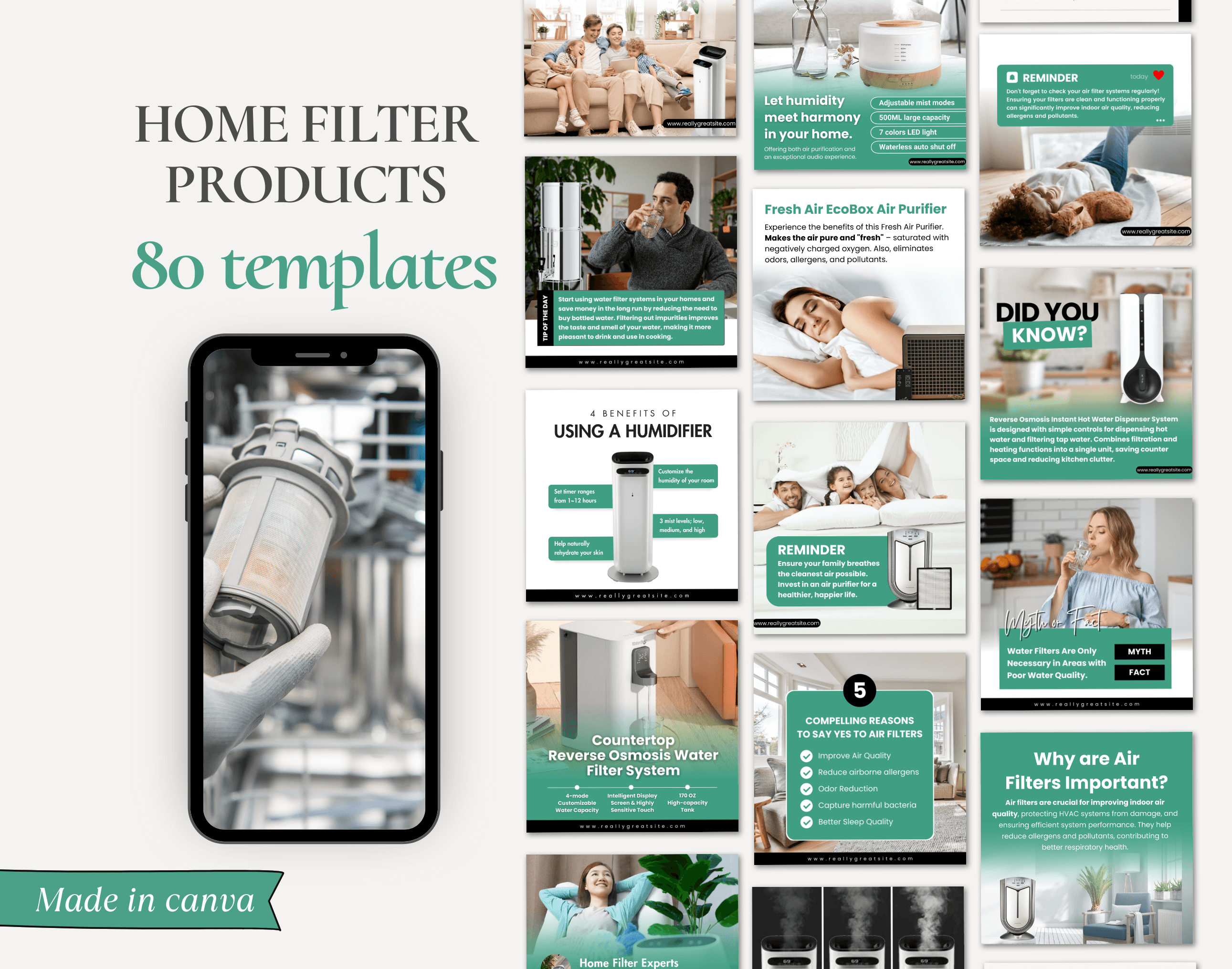 Enhance your home filter business with professionally designed Canva templates. Perfect for promoting water, air, shower, and replacement filters, these templates deliver a polished and engaging aesthetic. Ideal for boosting your brand’s visibility and performance across Facebook, Instagram, LinkedIn, Pinterest, and X.